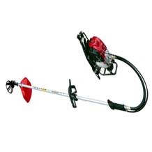 本实用新型公开了一种背扶式甜菜收割机,分两种结构形式,双背式收割机和斜挎式收割机,双背式收割机是小型汽油机后面连接有双背带装置,前面输出端通过软轴与内传动连杆连接,内传动连杆前端通过割头连接座、焊连接有小刀片的传动螺母与收割机机头传动连接。在内传动连杆上分别连接有肩带、防护罩、手柄座,手柄座上连接有双手柄和单手柄,双手柄的右侧手柄上连接有开关、油门、油门锁并通过电缆油门线与小型汽油机连接。所述的斜挎式收割机是小型汽油机前面输出端直接与内传动连杆连接。可采用双背式和斜挎式两种方式进行甜菜削缨,用汽油为燃料,结构简单、使用方便、生产效率高,适合中、小面积农田使用。