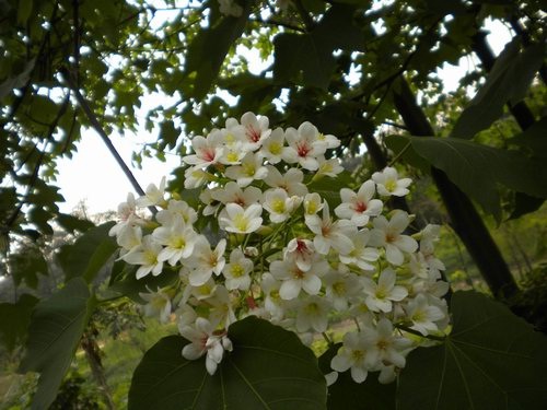 千年桐(Aleurites Montana E.H.Wilson),由于果皮皱纹,经济寿命长,故得名千年桐或皱桐,又名金臣树、木油桐、广东油桐,为大戟科(Euphorbiaceae)油桐属落叶性乔木,高达20m。树皮平滑,灰色,叶互生,全缘或2-5裂。花瓣5片,花瓣白色或基部带紫红色且有紫色脉纹;雌雄异株,或有时同株异序,花期3—5月,开花能招蜂引蝶。果实为核果,卵形至扁球形,但种子含有毒蛋白及皂素成分,误食会引起呕吐、腹泻及休克等症状。