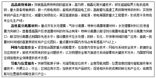 国家科技重大专项:国家科技重大专项是《科技规划纲要》确定的重大战略任务,是为了实现国家目标,通过核心技术突破和资源集成,在一定时限内完成的重大战略产品、关键共性技术和重大工程,是我国科技发展的重中之重。《科技规划纲要》确定了16个重大专项,涉及信息、生物等战略产业领域,能源资源环境和人民健康等重大紧迫问题,以及军民两用技术和国防技术。