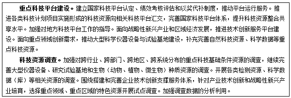——创新基地建设再上新台阶。符合经济社会发展要求和科技自身发展需求的创新基地布局更加合理。建设若干具有世界水平的研发机构和世界一流的研究型大学,建成一批重大科研基础设施和创新平台,形成比较完善的公共科技资源共享机制和服务体系。