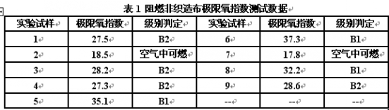 丙纶纺粘布和SMS复合布,这两类阻燃功能母粒添加型非织造布的极限氧指数,与水刺粘胶、PVA阻燃后整理非织造布的极限氧指数相比较明显偏低,在阻燃效果级别评定中相差了一个级别。