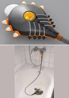 俄罗斯研制的浴室清洁机器人是自动清洁和整理浴室的一个新帮手。它的完美性能一定会令你大吃一惊。把这种装置接通水龙头后,它就开始利用抹布擦拭房间。无论是淋浴间、浴缸、水槽、地板,还是墙面,这种可爱的机器人会把它们擦拭得干干净净。更令人意想不到的是,它借助底部的吸盘能爬上墙面,把高处也擦拭干净。